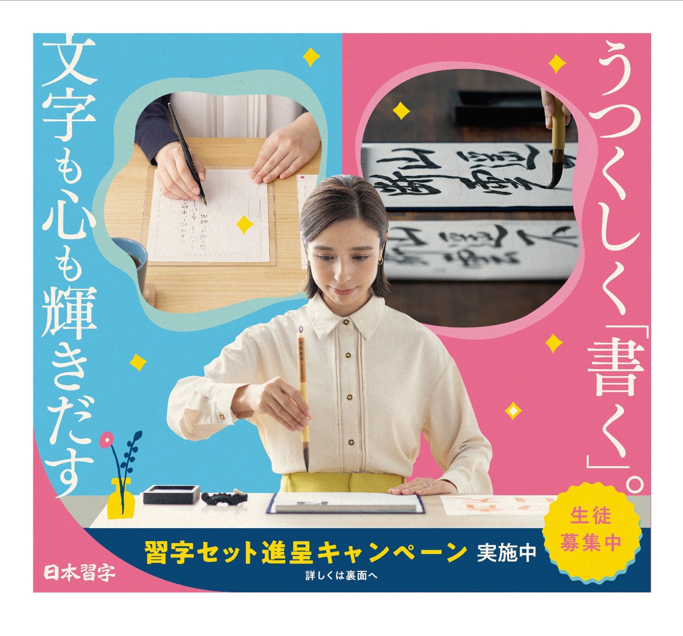 キャンペーン期間中、2026年度受講で3ヵ月以上の受講申込みの場合、習字セットを進呈いたします。(硯、筆、筆(小)、ぶんちん、検定半紙用ラシャ下敷き、鞄